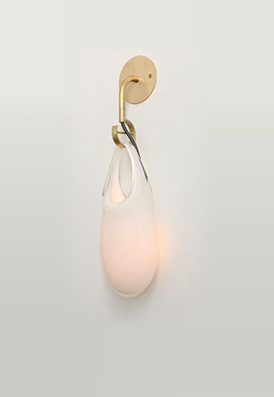 An expressive glass vessel that appears to droop from its hook as if molten serves as a shade on this wall sconce. Available in two sizes. The socket is suspended from the hook on a fabric-wrapped electrical cord and is loosely suspended within the glass. A removable threaded pin within the brass hook can be used to secure the glass if required.