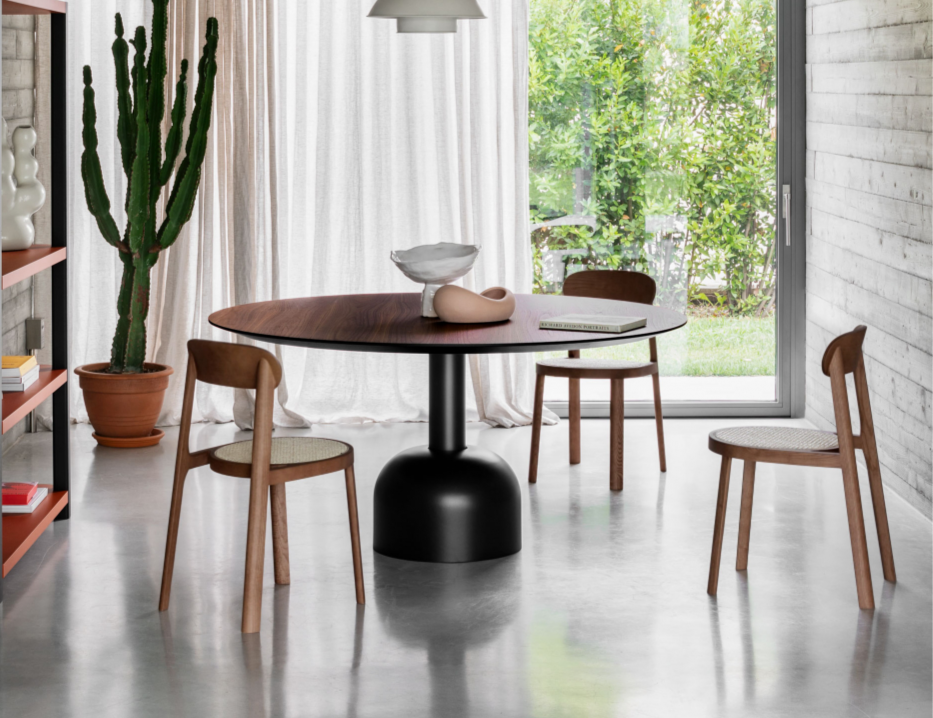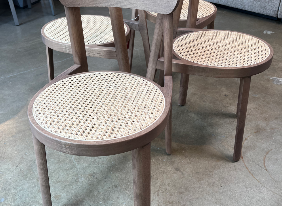 Inspired by 20th-century Austrian chairs, Brulla is a stackable wooden seat. Its defining aesthetic is given by the juxtaposition of curves and straight lines, creating a strong sense of identity and minimalist spirit: the dynamic momentum of the backrest and back legs meets a slightly tilted cane-webbed seat, balanced harmoniously by the front legs. Thus, its retro taste combines with the distinctive profile of the legs, which, together with other discreet details, enrich Brulla with contemporary codes. 4 chairs available for sale.